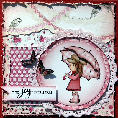 Today's card is done using "Wet & Rainy Days Fun#DM12009" image. This is from the new Fall 2012 line. The image is colored with promarkers. The papers are from Lost & Found - My Mind's Eye - Blush 6x6 paper pad. I paper pierced the umbrella and boots. I popped the top part of the umbrella to give it dimension. There is a lot of fussy cutting here using the Tim Holtz distresser. I also inked the edges using distress inks. The doily is from the dollar store. TFL and have a wonderful weekend.